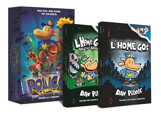 Ha arribat un nou heroi, l'Home Gos! Amb el cos d'un humà i el cervell d'un gos, protegirà la ciutat i lluitarà contra les terribles maleses del gat més dolent del món. Llibres plens d'acció, misteri, humor, bajanades i infermeres genials. Si vols saber d'on va sortir el malvat Pepet o com es van conèixer l'Home Gos i el Cap, aquest és el teu pack! Lot amb els llibres "L'Home Gos" i "L'Home Gos. Un cas bullangós".