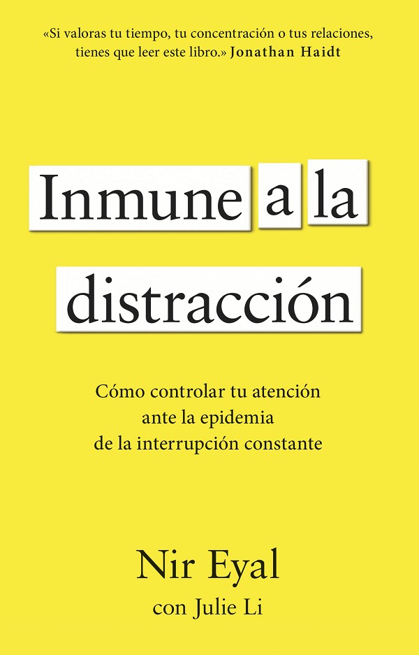 BEST SELLER INTERNACIONAL El gurú del marketing y experto en tecnología comparte su experiencia y consejos clave para recuperar nuestra atención Estás en la oficina trabajando cuando una notificación te interrumpe. Intentas volver a concéntrarte, pero un compañero se acerca a charlar. En casa, las pantallas invaden tu tiempo en familia. Empieza un nuevo día y tus objetivos más importantes siguen en pausa. ¿Cuándo dejaste que la tecnología tomara el control de tu vida? ¿Qué lograrías si fueras inmune a las distracciones? En este libro, el experto en comportamiento Nir Eyal revela las causas psicológicas que nos empujan a la distracción y propone un modelo en cuatro pasos para lograr, por fin, hacer aquello que nos proponemos. Eyal defiende que nuestras relaciones personales dependen de nuestra capacidad para estar presentes y aborda el reto de educar a niños en un mundo hiperconectado. Este libro proporciona herramientas prácticas para aprovechar lo mejor de la tecnología sin que nos domine. Inspirador y motivador, este clásico de la productividad te ayudará a recuperar el control de tu vida y alcanzar tus objetivos.